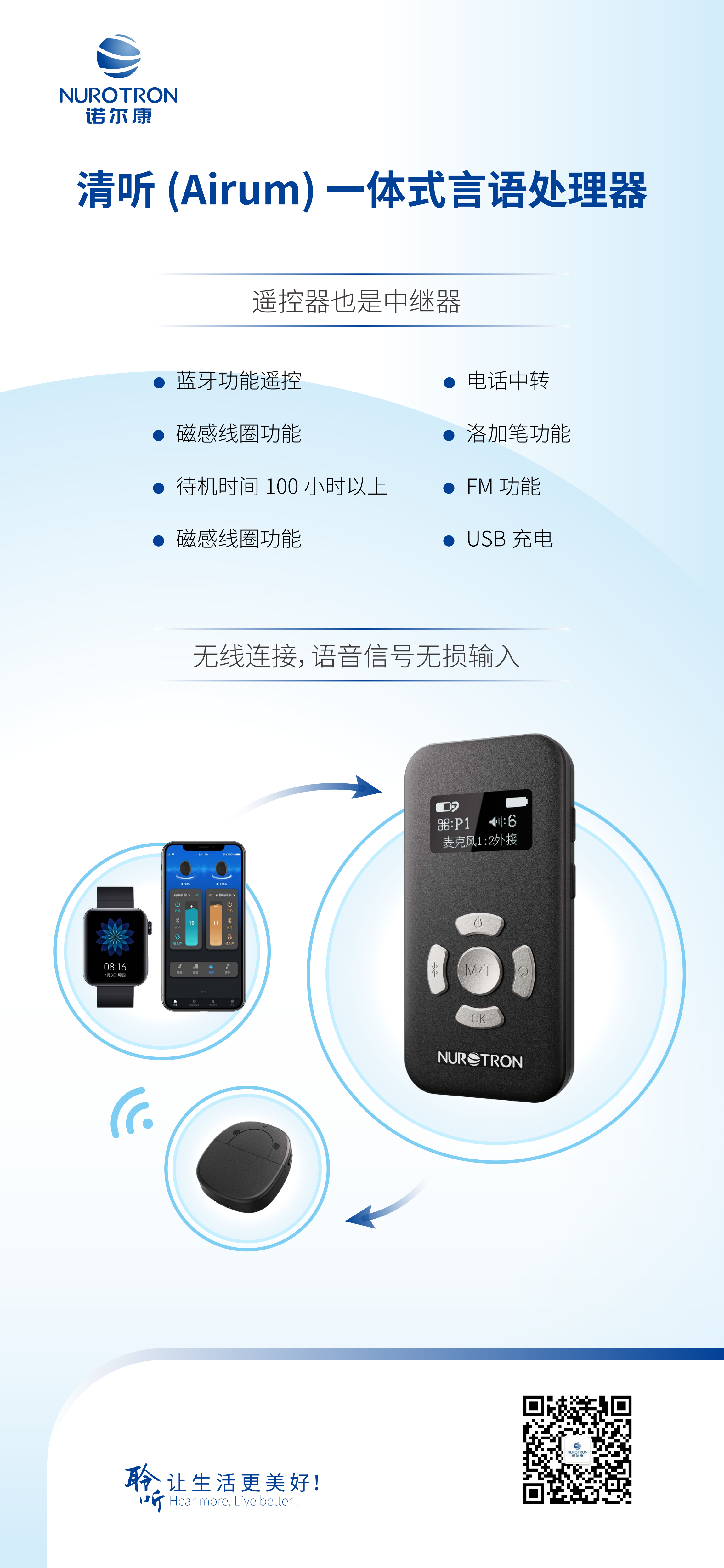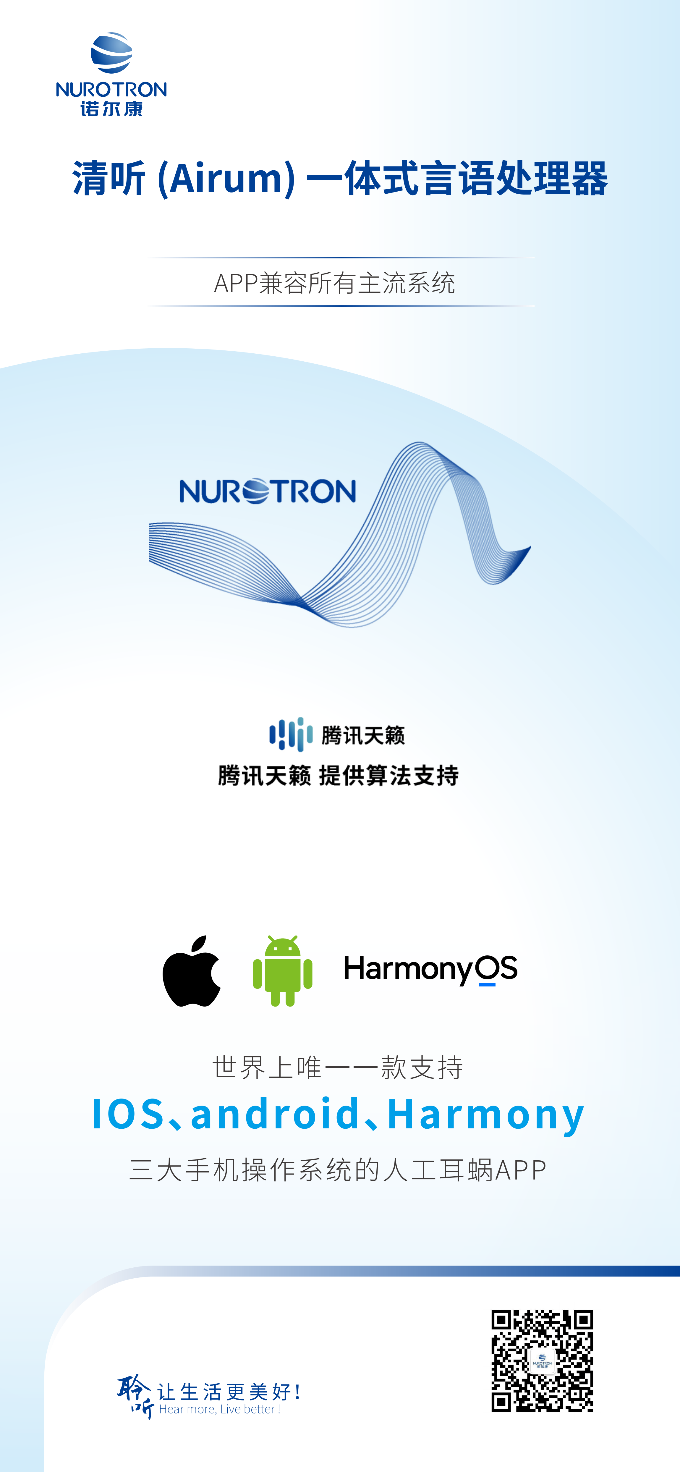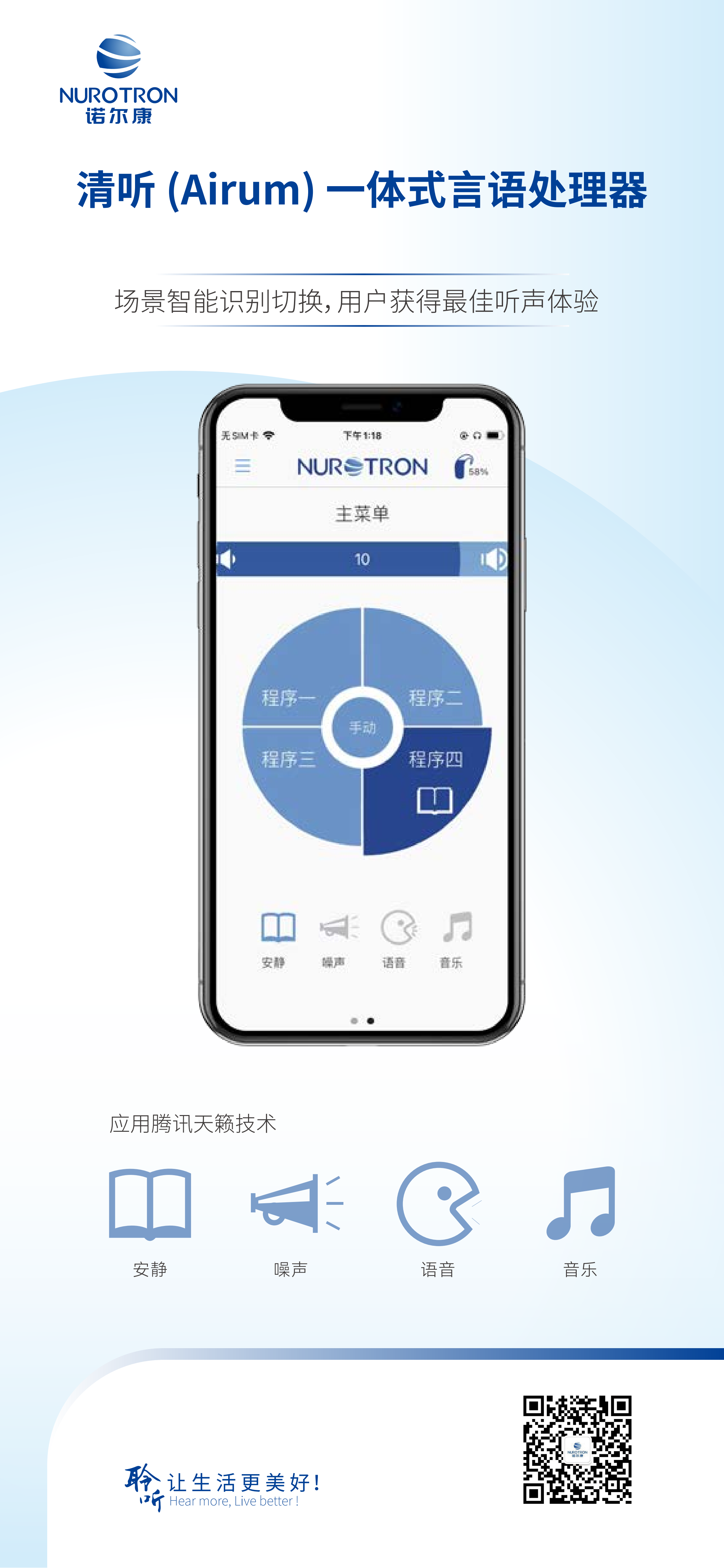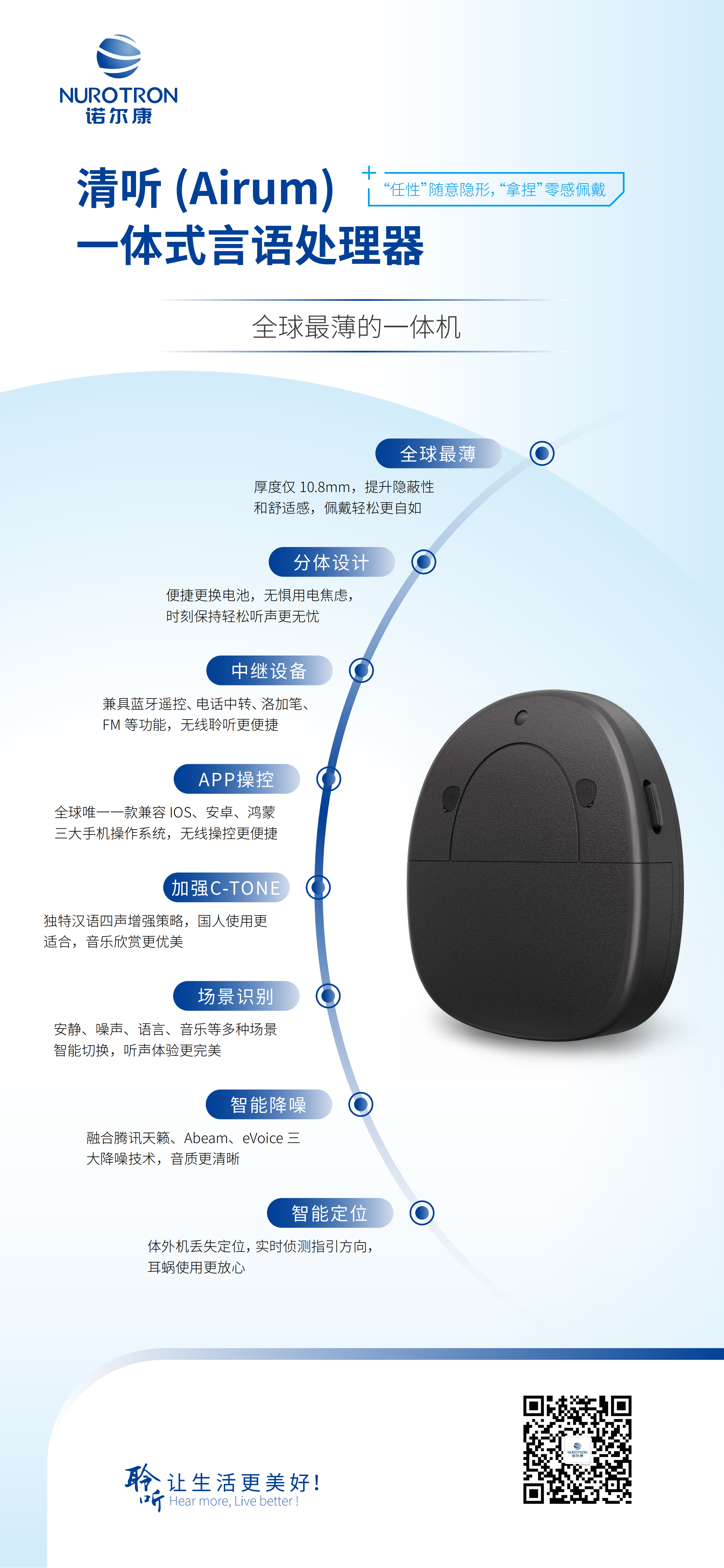 諾爾康第四代言語處理器,融合18年研發智慧及產品經驗,10.8mm纖薄機身,輕松隱于耳后發絲間,電池分體式設計,24小時電量續航,搭載智能降噪技術,諾音App即時操控,讓您隨時隨地,自在聆聽。